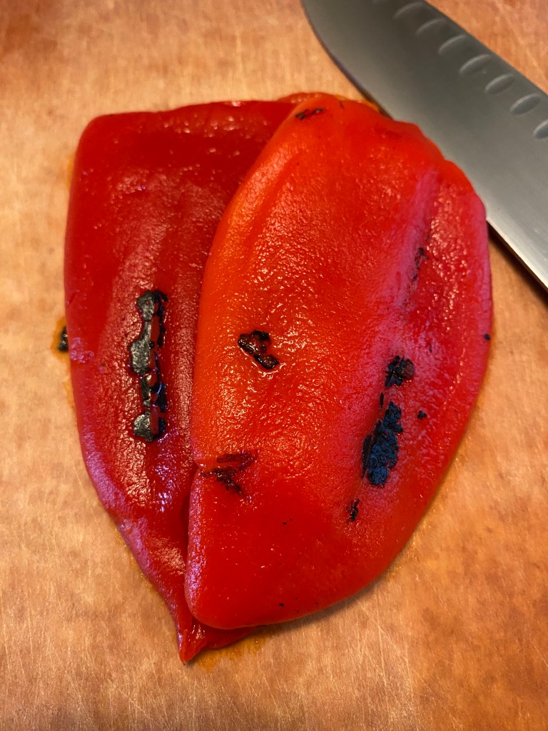 1.) We’re going for a roasted flavor profile here, so let’s start roasting. Preheat a stainless steel pan with neutral oil on medium/high. Once heated, place your garlic cloves inside and brown all sides until…brown, approximately a few minutes. Then once done, do the same with your already roasted red pepper to give it extra charred flavor.
