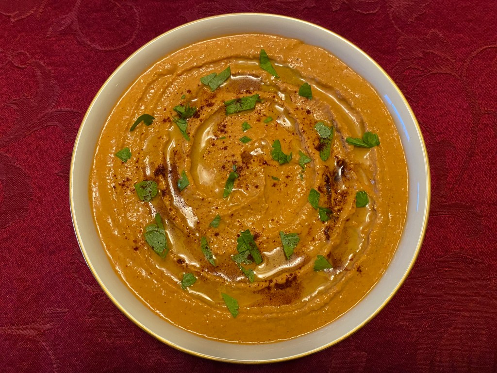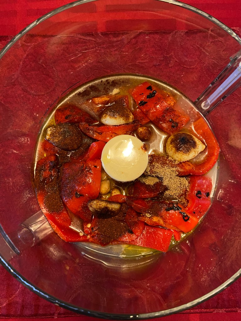 3.) Once blended, pour it on into a serving bowl and keep refrigerated for at least one hour, but the more the merrier. Once you are ready to serve, take it out, garnish with extra olive oil, paprika and a bit of roughly cut up flat leaf parsley, and really wow your friends, or your cat, or your plant babies or whatever floats your boat.