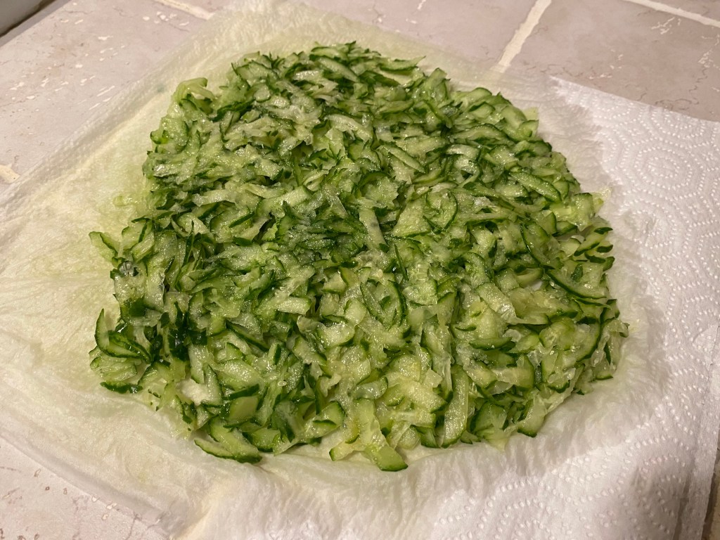 2.) Now, the next step is vital and that is to drain your cucumber of water. Either put into a colander in the sink or over a bowl or even put some paper towels down and let the cucumber rest there, finally putting another towel over and patting everything down.