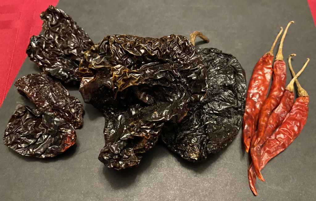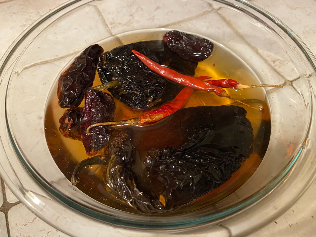 The chiles I’ve selected would love to spend some time together, but if you can’t find one or more, California or New Mexico chiles can be substituted. These are all dried chiles ready to be reconstituted for the recipe. You COULD get fresh chiles like jalapenos or serranos to substitute for the dried chiles de arbol, but this would skip the reconstitution phase, and many alterations to the dish would need to be made. One could also use canned chipotles, but they usually come in adobo sauce, but hey, that sounds pretty good too.