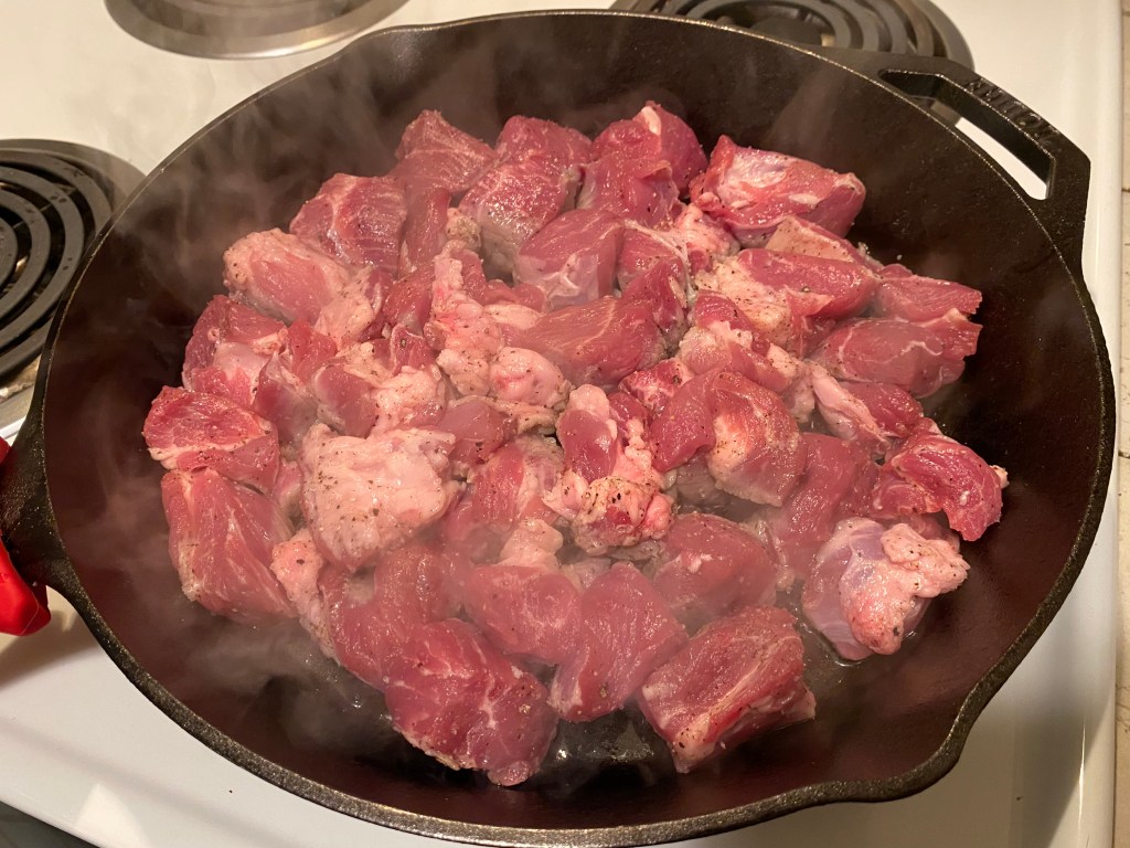 1.) Prepare the meat! Remove meat from any packaging and pat dry with paper towels to absorb any liquid. This is a SUPER important first step in ensuring you get a nice browning action since excess water won’t let the meat “sear.” Cube pork shoulder into about 1.5 in. cubes: They will shrink (gasp!). Once cubed, add (roughly) 1 tbsp kosher salt and 1 tsp fresh cracked pepper to meat and mix in a bowl or on a dedicated cutting board. Preheat a 12 inch cast iron skillet (or same pot listed in step 3 if you don’t have a cast iron skillet or perhaps a stainless steel one) medium/high with 2 tbsp neutral oil (I use avocado) until you can see the oil “shimmering.” Don’t use olive oil as it’s smoke point is too low and will affect flavor. Don’t let the oil smoke since that means it’s burning and will alter the flavor further. In addition, you’ll know you’re there when you place the meat in the pan and it has that magical sizzling sound.