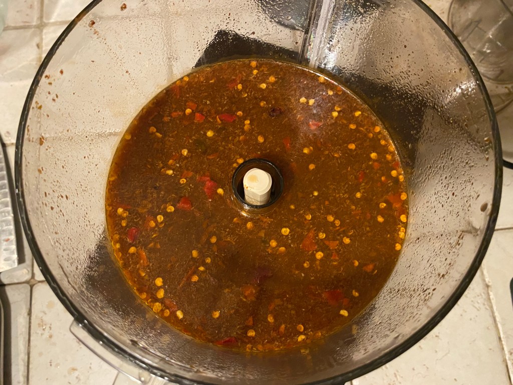 6.) Let’s get back to the chiles! Add all of the contents of the pepper mixing bowl into a blender or food processor and…well…blend together until everything is…blended…into a nice slurry. Add these contents into the pot and stir.