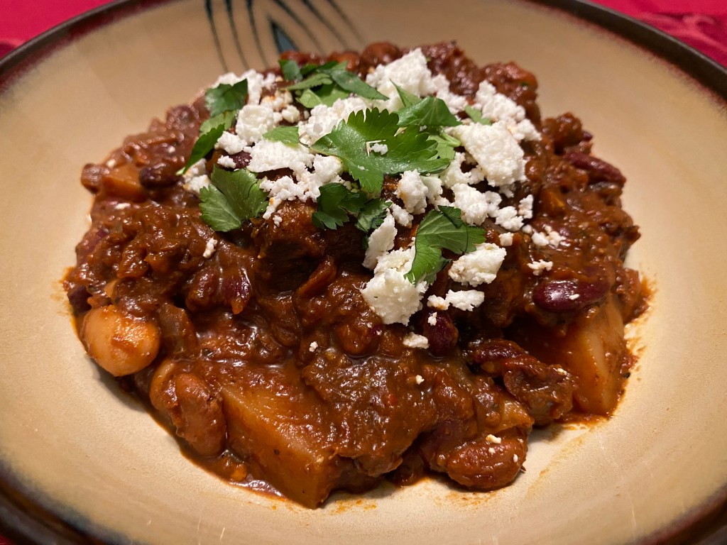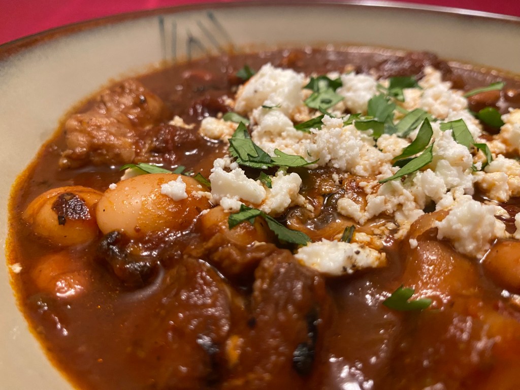 This is stew, now reduced down after simmering for a longer period of time. Same Cotija cheese and cilantro.