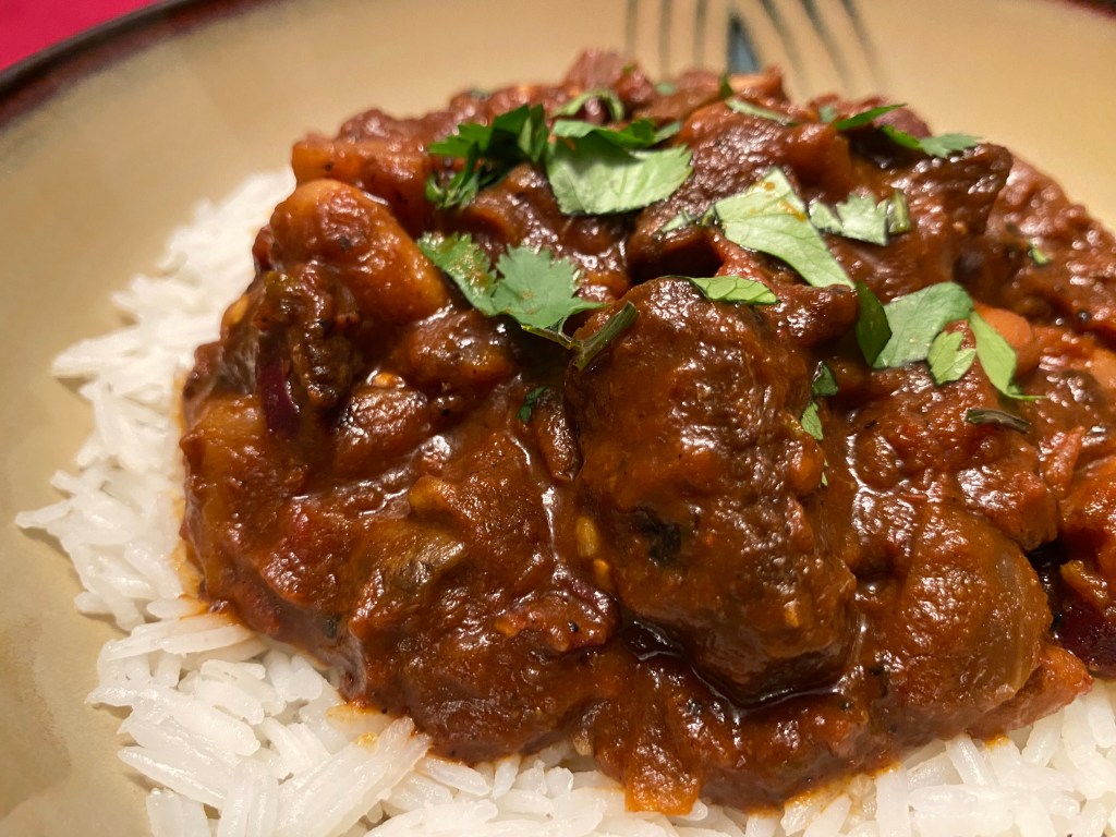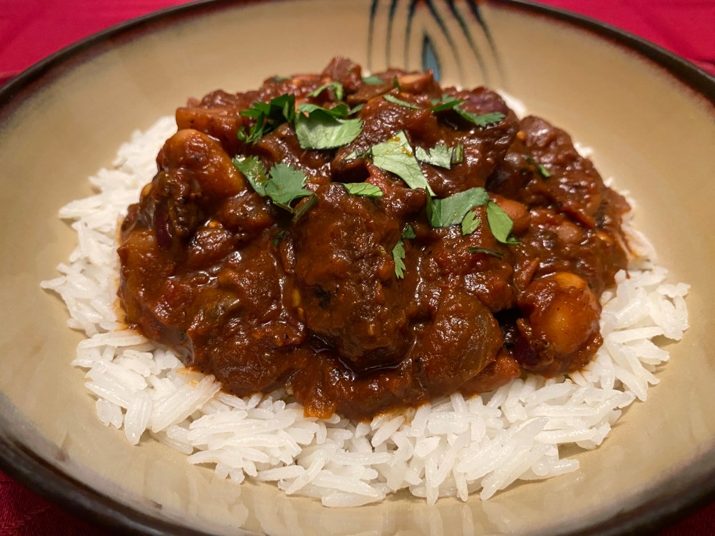 This one seems to be the favorite among those I’ve served it to. I’ve included the stew on a bed of Basmati rice, topped again for a final time with cilantro. The fragrant Basmati rice really transforms it from a Mexican/Central American-esque dish to an Indian one quickly, minus the Cotija Cheese of course.