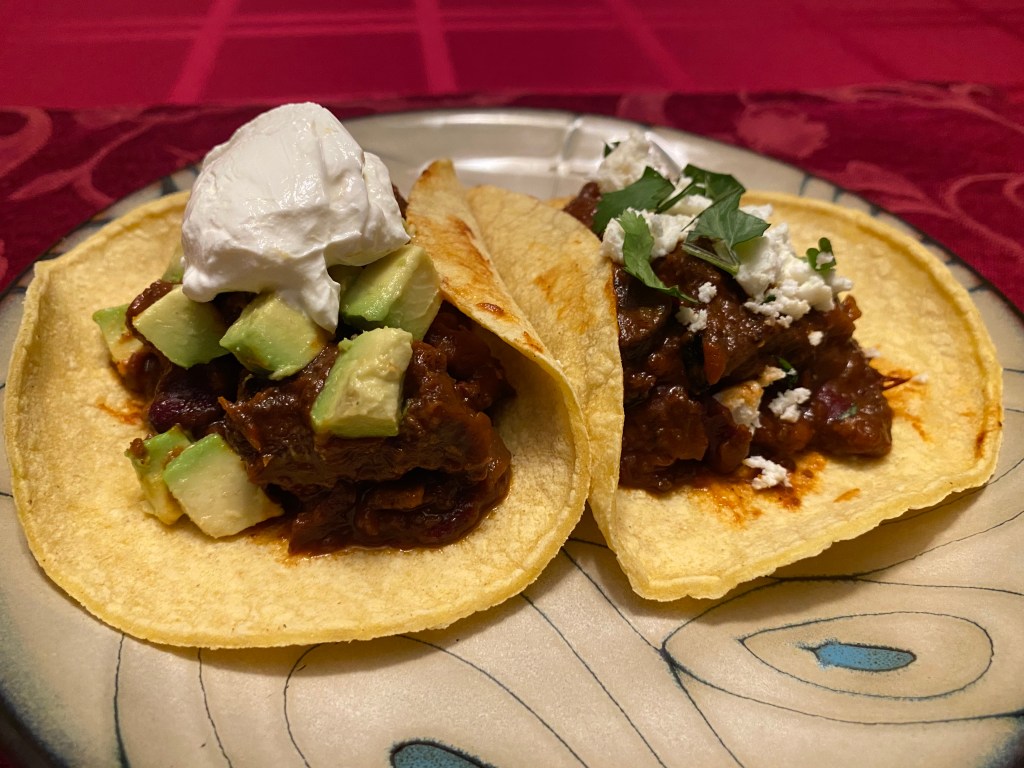 Here, it’s the same reduced stew but plopped in into 2 corn taco size tortillas. The one on the left is served with cubed avocado and sour cream. The one on the right once again has Cotija cheese and cilantro.