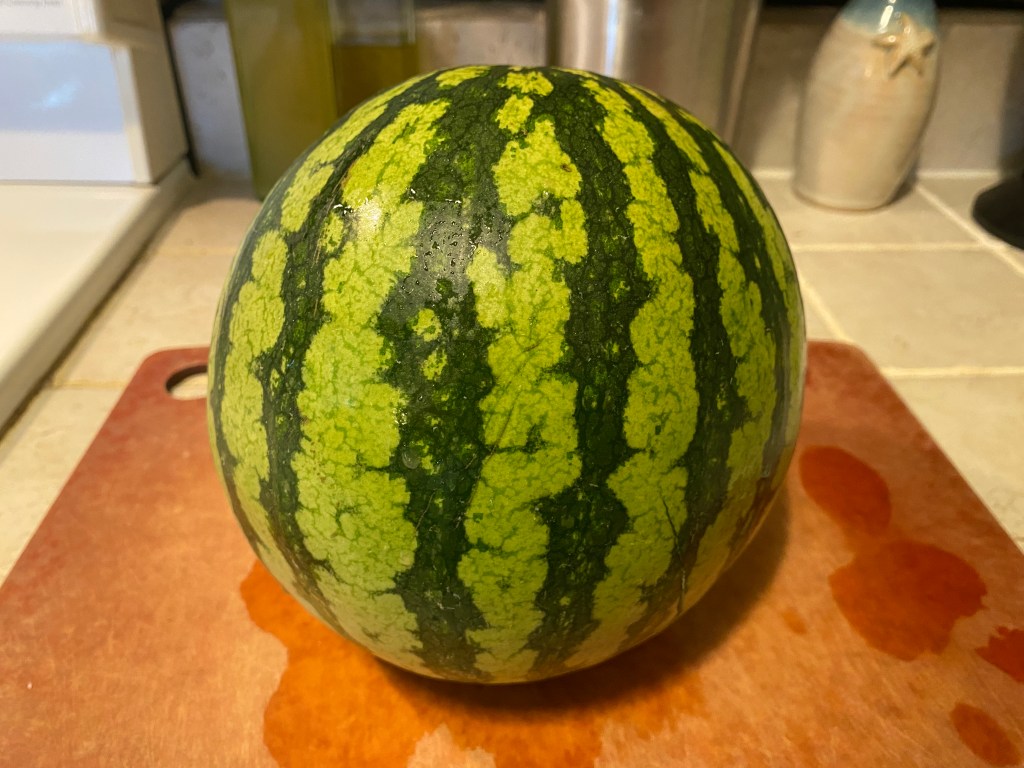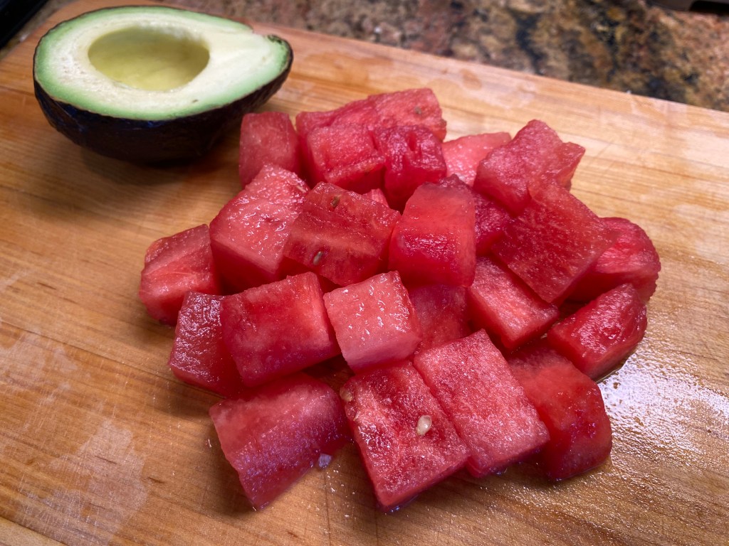 1.) Pick a beautiful, ripe, smallish watermelon, or just go to the store and buy some cut up pieces if you’re feeling lethargic. If choosing option A, cube that splendiferous crimson melon into roughly 1 inch pieces. Do the same with your velvety emerald avocado and admire the beauty that is your handiwork for a short spell.