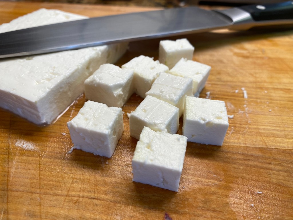 4.) The next step involves the Feta cheese. I like to use whole blocks of Feta in brine as they are the freshest, but if you’ve got crumbled Feta already in the fridge, or are just used to it and set in your ways, use that instead. If using whole Feta, cut into small cubes and set aside until finished.