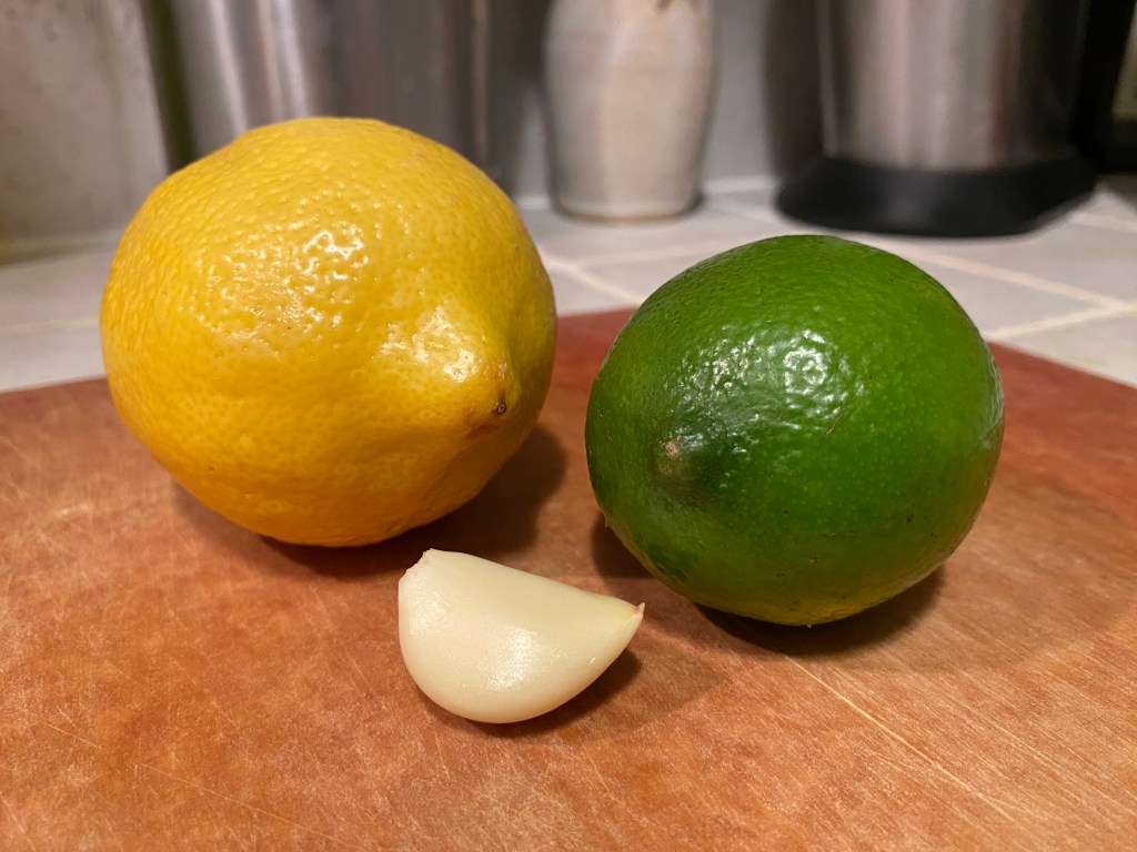 5.) Next comes the dressing. Some may think the garlic will overpower everything. Well, this is one time that I say less is more as the garlic will be just enough to add some “oomph” without feeling like you went 12 rounds with Mike Tyson in his prime. Mince up your garlic (make it tiny) and squeeze your citrus and add them to a small mixing bowl along with your oil and the second pinch of salt. Swirl them all up good.