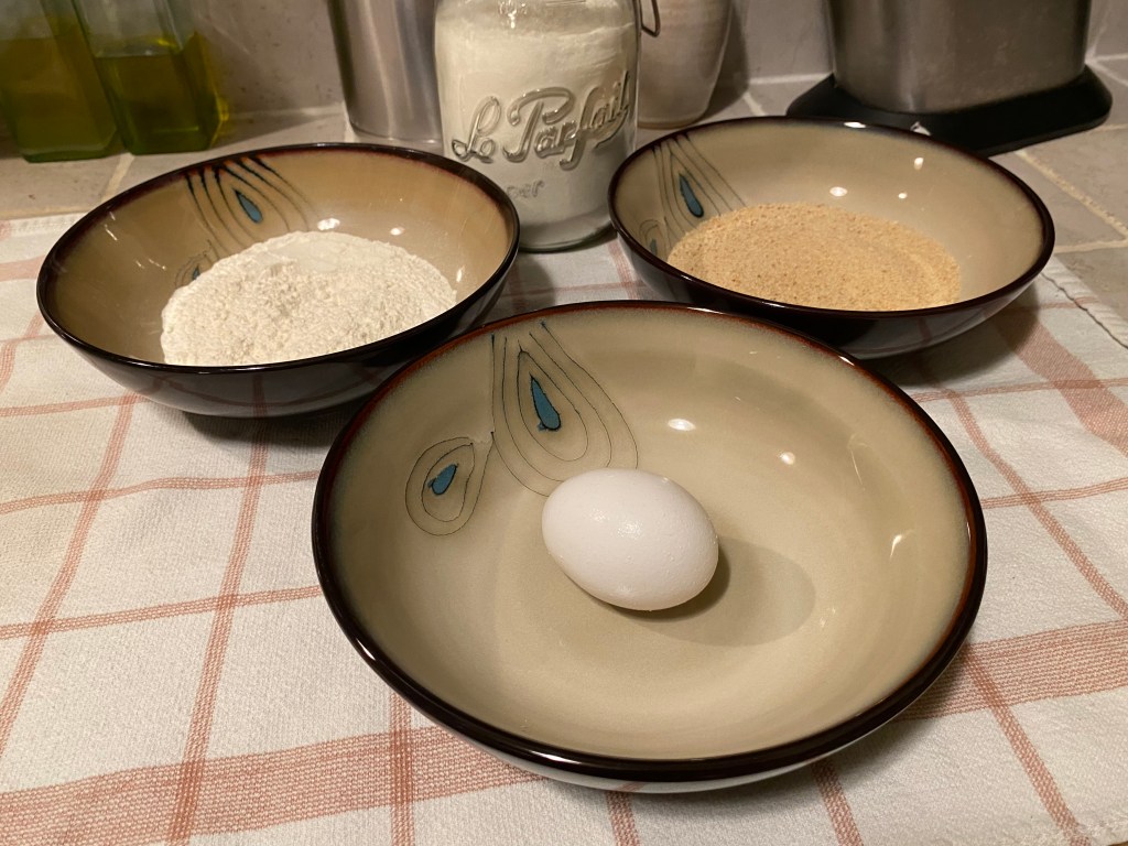 3.) Now it’s time to bread the fish. Get three large shallow bowls, one for the flour, one for the egg and one for the bread crumbs. I used one egg, but use two to play it safe. Whip up the egg in its own bowl and let us begin. First, give your fish a nice coating of salt and pepper, then dredge in this order: flour, egg, and then bread crumbs. The flour will let the egg adhere better which will then let the bread crumbs adhere better. This is only a light breading, so don’t go too heavy handed. We don’t need to turn this into KFF (Kentucky fried fish).