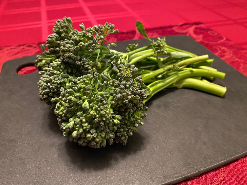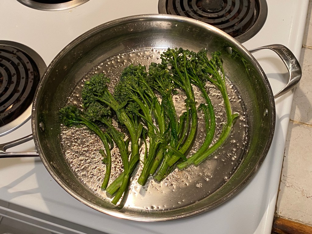 4.) Heat up a 12 inch pan to medium and add 2 Tbsp. of olive oil. Broccolini is a rather new invention, in case you didn’t know that, so this is your modern, obligatory, vegetable garnish if you will. Throw some whole broccolini in there and add some salt and pepper and just let it sit, getting a little brown on one side. After a few minutes, toss in a knot of butter (1 Tbsp.), let that melt a bit and stir it all up. Let the other side brown for a couple minutes. Add a quarter cup of water and cover and let it steam for 3-5 minutes or until it is to the softness you like. If that’s not some easy veg, I don’t know what is.