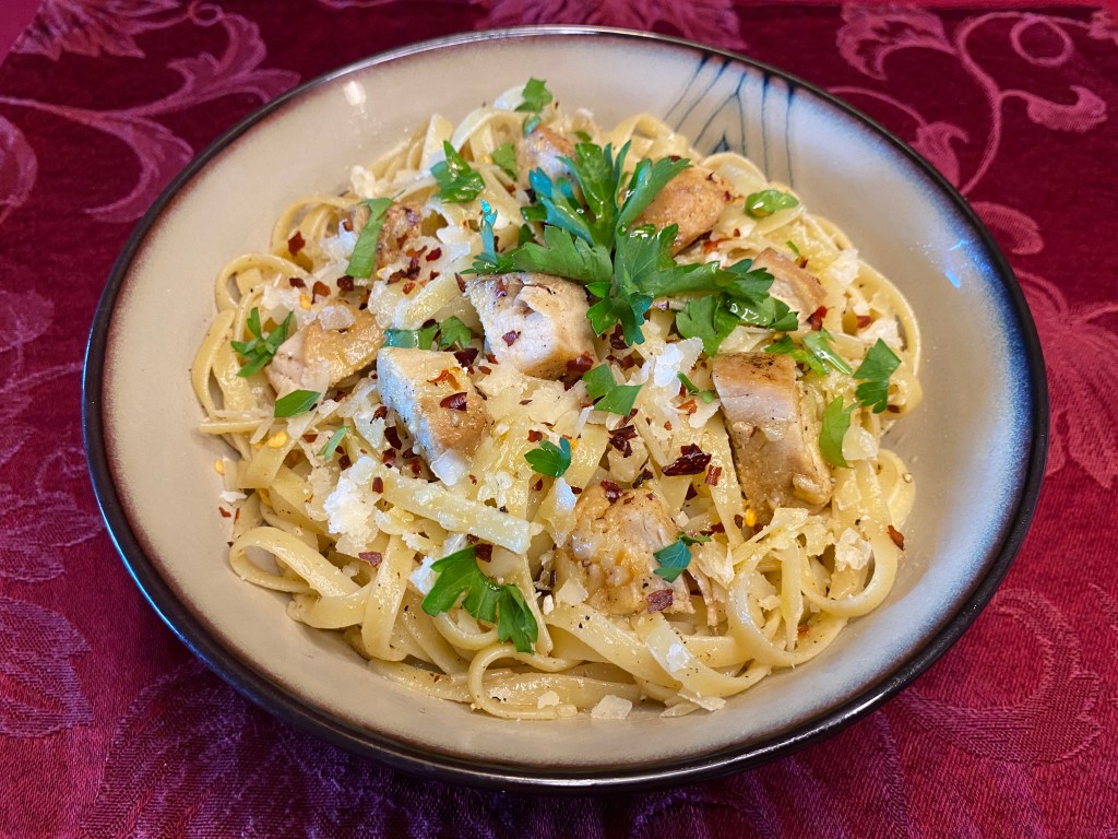 4.) Add the pasta back into the pan and add the black pepper. Stir everything until all of the ingredients are nicely coated in butter and oil, and the chicken, garlic, and pepper are equally dispersed. Now we lump everything into a large bowl or dinner plate and garnish with some cheese, parsley, and red pepper flakes and maybe a little extra black pepper. You might as well give the whole thing an extra glug of olive oil while you’re at it.