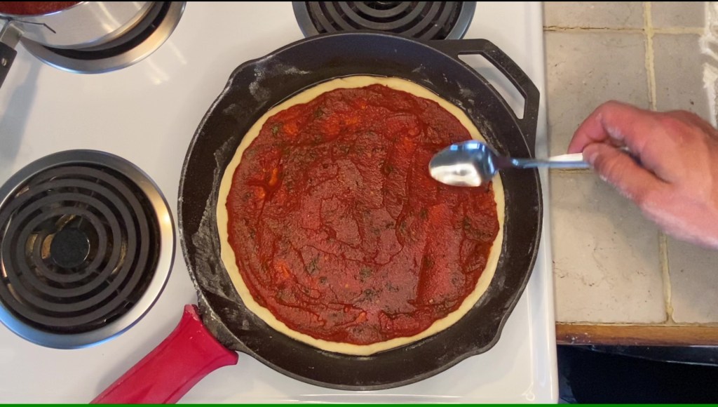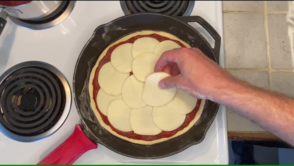 Evenly coat the skillet with a tablespoon of olive oil and place your flattened dough inside and make sure it reaches at least the edges. Now, distribute a nice even layer (or two) of sauce almost to the edges of the dough. We’re not going for a large crust here. Next, slice up your mozzarella, using about 2/3 of a 1 lb. log, into somewhat thin slices and lay them down in a circular fashion with just a bit of over lap over the layer of sauce for good cheesy coverage. Then, layer your deli meats also in a circular fashion, topping with the coppa for a dramatic, well marbled look. The Soppressata gives a nice large base, the peppered salami gives an earthy, peppery middle, and the coppa gives a fatty, oily topper that really visually pops on the table.