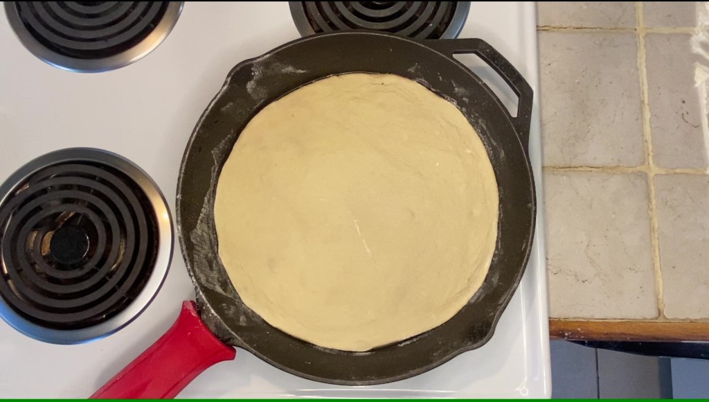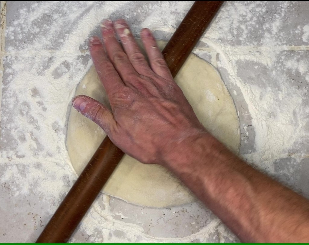 Follow the instructions on your dough, if it came with any, but I’ll give you some basic guidelines here. Take your dough out for at least 30 minutes before you start. Well season your countertop with all purpose flour so the dough doesn’t stick and plop that ball right on down. Use a rolling pin to roll the dough out into approximately 12 inches in diameter. If you don’t have a rolling pin, you can use any cylindrical object like a wine bottle (you know who you are) or an old clothing rod from a closet that an electrician had to remove when he installed a new, larger breaker box and the rod no longer fit in said closet.