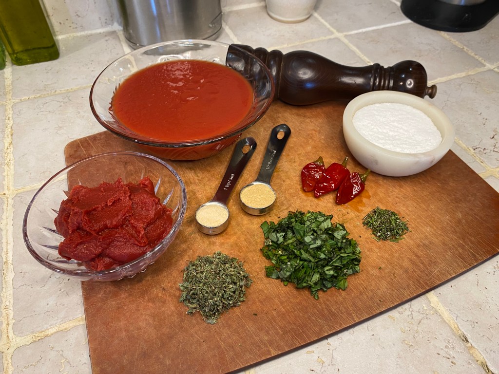 1.) We gotta make the sauce first, so it gets to marinate in its own juices while we’re putting the rest of the pizza together. Preheat a medium saucepan to medium heat, add some olive oil, and add your tomato paste. Heat it up just to get it a little warm and pliable, for about 30 seconds, and then add your herbs. I chose the standard go-to basil for some sweetness, some oregano for some savory, and a little rosemary for complexity. Mix it all up and add the tomato sauce, then your minced peppers, and salt and pepper, stirring until everything is well blended. Simmer on low for 15 minutes, stirring every other minute or so. Remove from heat, and set aside for later. The simmering allows everything to release their flavors better and meld together.