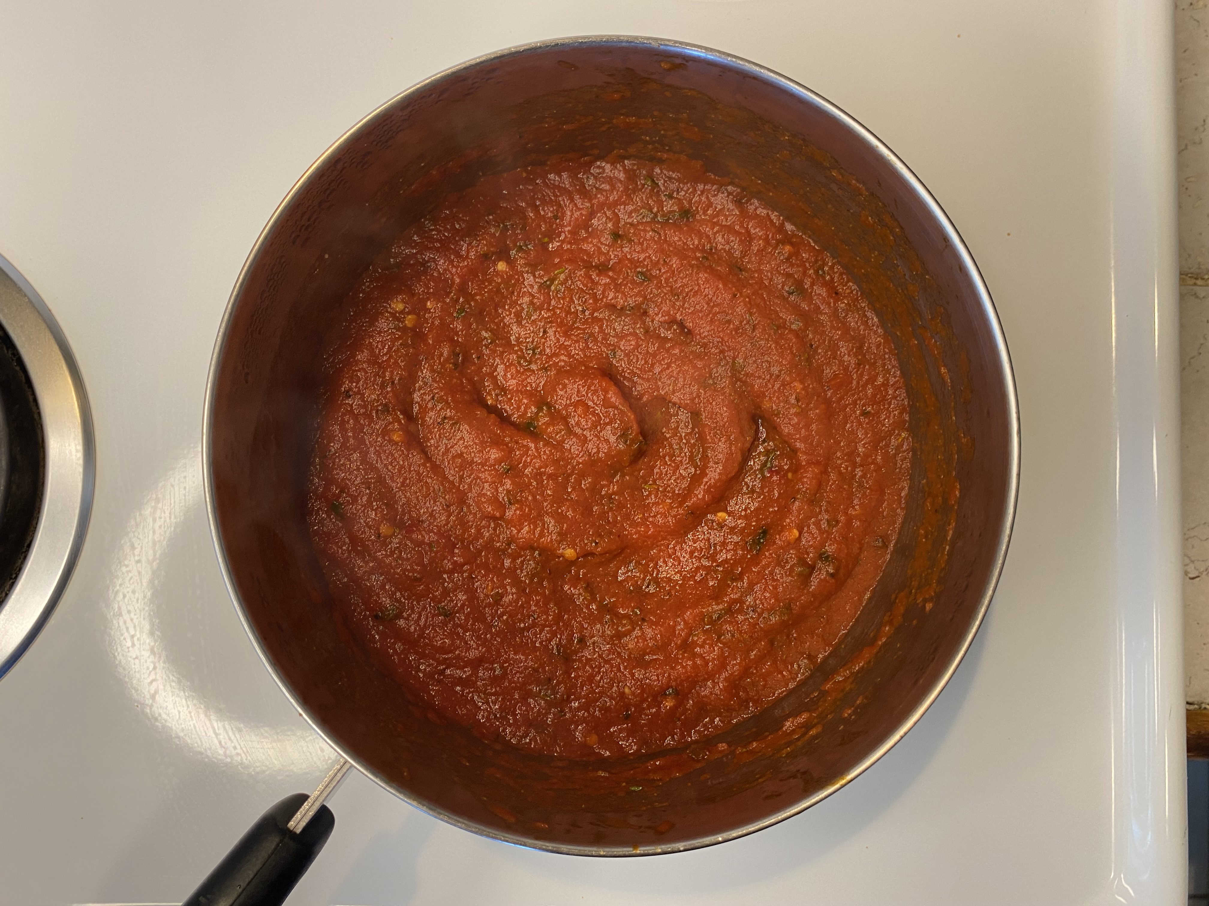 One thing you might notice is that even on low, the sauce may decide, seemingly out of nowhere, to explode onto your previously clean stovetop and anywhere else it can reach. Feel free to put a lid on top between your stirrings.