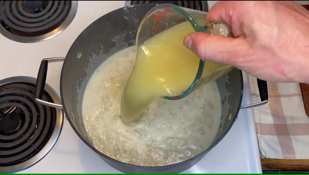 Now, why the cayenne powder? You might be asking, “I’ve had broccoli and cheddar soup before and it wasn’t spicy, why am I adding cayenne powder?” Well, to answer your question, I wouldn’t be writing this recipe if there wasn’t something extra thrown in. Don’t be scared, put that spice in there, pour your milk in and let that heat up for a couple of moments while you get your broth.