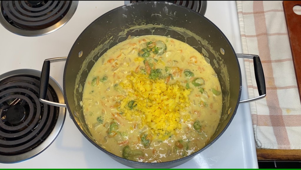 6.) Finally. The time has come to add the cheese. I would do this in quarters, meaning 1/4 of your load at a time. Pour some in and then stir it until you feel it has incorporated into the soup. This may take a minute or longer each, so be patient. Do this four times to be on your way to cheesy goodness. By this point, the broccoli and carrots will have been cooking for about 15 minutes, meaning they should be done.