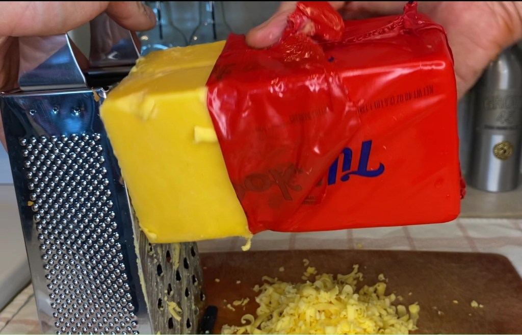 2.) Number two on the list, the cheese. Instead of taking the easy route like the broccoli, buy a brick and shred it yourself. It tastes better and melts more easily since it doesn’t have any extra preservatives that they add to shredded cheese so it stays fresh. You’ll be grating for a while, but think of it as a tiny workout to help burn off a minuscule bit of the gigantic quantity of cheese you’ll be consuming. Put that aside in a bowl as well.
