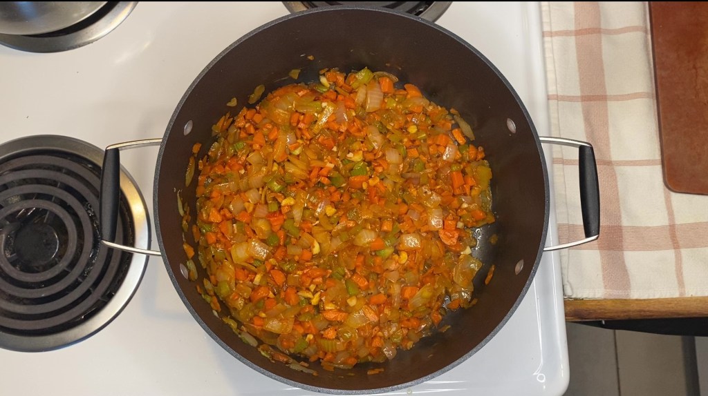 4.) Now you’re going to cook your mirepoix. Start by putting the heat back on to medium, let the pot warm back up a bit and add your neutral oil once more. Once that’s nice and toasty, drop in the diced onion. Let that cook for 5 minutes until nice and soft, stirring occasionally. Then add your carrots and celery and cook for another 5 minutes, again stirring occasionally. Lastly, you’ll add your tomato paste, garlic, spices, and red wine vinegar and stir those in until well integrated. The spices are just for a HINT of flavor as I don’t want to overpower the flavors from the blended peppers themselves, which is the whole freakin’ point of this recipe anyway. As a side note, you don’t want to cook your garlic for much longer than about 2 minutes because this will overcook the garlic and make them sweet instead of ‘garlicky,’ so make sure you move onto the next step quickly.