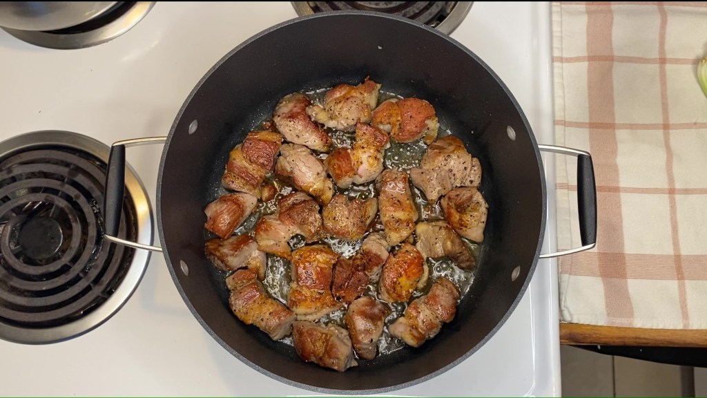 Preheat a stock pot or Dutch oven on ‘almost’ high at about 7-8/10. Add your neutral oil before adding your meat. Once the pot is hot and the oil isn’t burning, add your meat, and cook each side of the cubes (roughly 1 minute each side) until they are browned, but not blackened, to your liking. You are not fully cooking them through just yet. Once this is done, remove the pork from the pot and put back (with all the juices) into your mixing bowl.