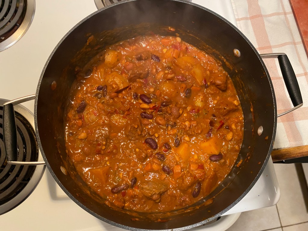Once you return, it’s time to add all your beans. You want to add these later because cooking them for too long will turn them to mush, and you don’t want mushy beans. Cook everything together for 1 more hour on low, covered, but stirring occasionally. This is when you check to see if it’s done. Is the meat super tender? Do the potatoes and beans melt in your mouth? If the answers are yes and yes, you’re done. If not, keep going! The reason we saved an additional cup of peppery water from before is so you can add it to the stew since some of the liquid will evaporate from simmering. Use that reserve to replenish the stew over the course of simmering since it is more flavorful than regular water. The total simmering process should take somewhere between one and a half to two hours, depending on your stovetop’s heat.