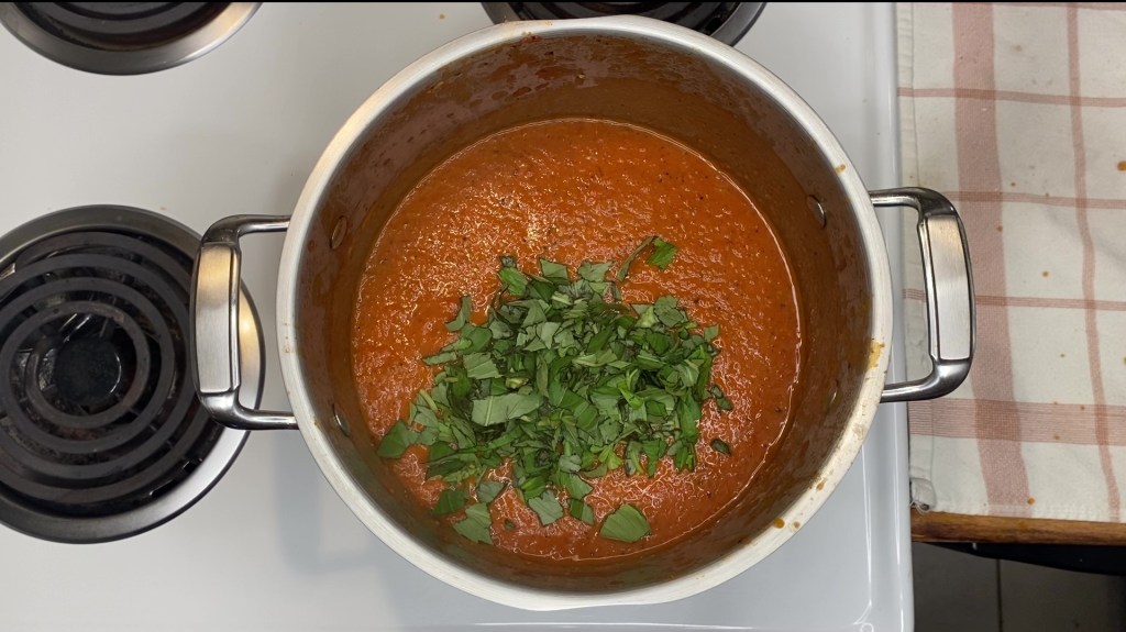 We’re down the home stretch, so add your chopped basil and incorporate to cross that finish line. Adding the basil near the end ensures it doesn’t cook too much because the fresh basil will lose its texture and flavor if left to simmer for too long. So congrats, you’re done with the soup, and now it’s time to move on to the grilled cheese, so take your soup off the heat, cover, and set aside.