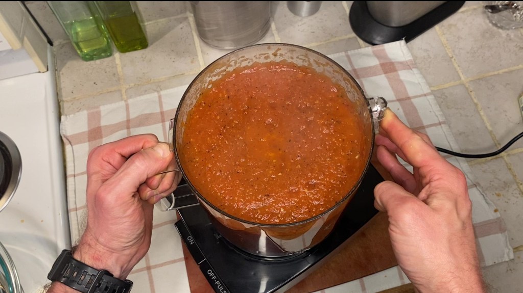 Guess what, I don’t have an immersion blender, and neither do you. So this is where the potential for calamity (excellent 80’s hard rock album name) intensifies, so be on your best behavior here. Carefully transfer your slightly cooled soup to either a blender or food processor in batches and pulse the soup to your desired consistency. I went with a medium-coarse grind, in coffee terms, which retains the chunk, but gives a real mouth-pleasing smoothness in texture at the same time. In other words, I just held down the pulse button a few times. Put your slightly blended batches into a large mixing bowl until complete, then transfer back into the pot to continue cooking.