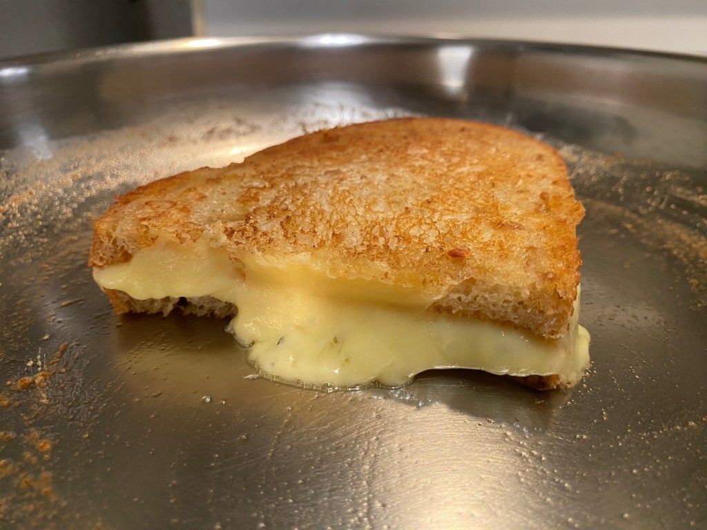 Place the cheese slices on one piece of bread and let everything sit there for 1 minute, then put the other slice on top. Let the bottom slice of bread toast for another minute, then flip the whole sandwich to even out the other slice.