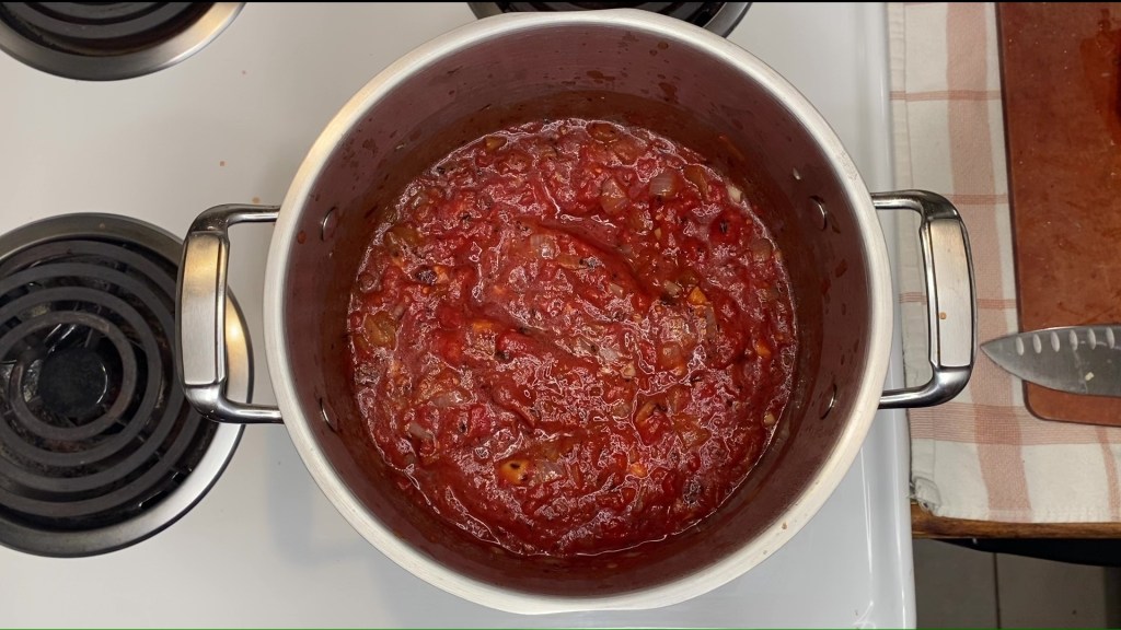 2.) Next are the stars of the show, the tomatoes. Normally, I go with canned whole tomatoes and crush them myself for better control of texture and flavor. I wanted to do that, but since I wanted to go with fire-roasted tomatoes, the pre-crushed ones seem to be far more readily available in canned form, and I decided to bend the knee out of sheer complacency. If your store has the whole fire-roasted ones, then by all means, use those and add the step of hand crushing them yourself. Pour those in and stir it all together.