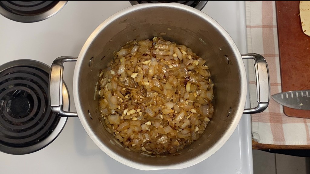 (Important Side Note – I initially wanted to simply soften my onions up like I do for other soups and stews. My stovetop is grade-F doodoo and tends to crank itself up to the blistering temperature of Helios, the sun god himself, whenever it damn pleases. When making this recipe before writing this, my cursed stove did exactly that and browned my onions. I decided to keep them that way and I believe it adds more depth to the recipe. You can go with the slow cooked translucent, softened route to play it safe, but I really do think the browned onions are the way to go.)