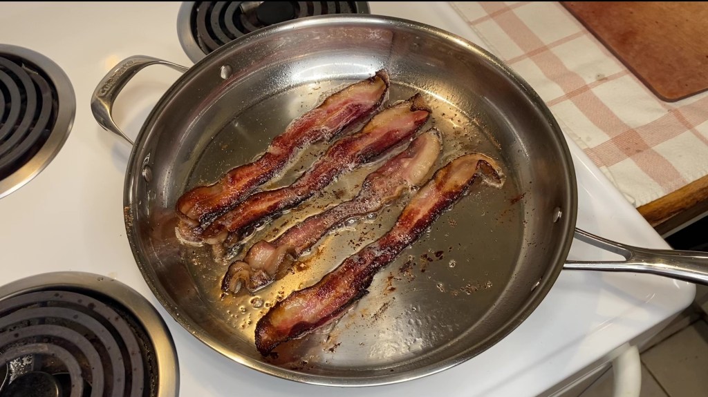 1.) Take out a large (12 in. preferred) stainless steel pan and heat on medium. Don’t add any oil because the bacon will cook in its own fat, which will be really useful later on as well. I don’t like my bacon too crispy, so cooking for 3 minutes a side is where I want it to be. If you want it crispier, guess what? Cook it a bit longer. Once done, remove from the pan, but leave the grease.