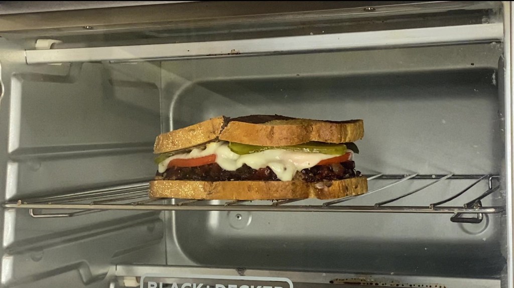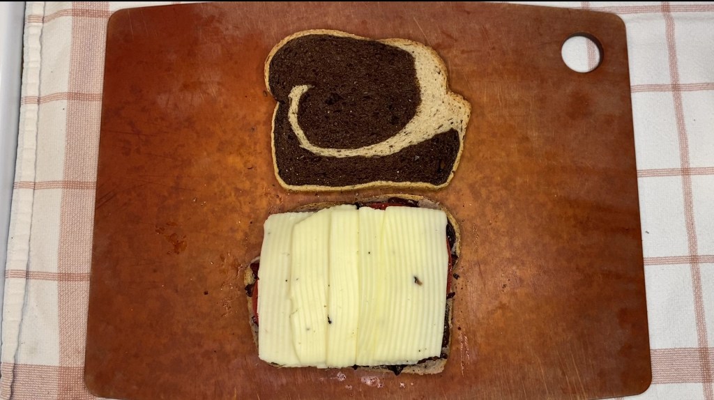 4.) Place that sandwich (gently) into your oven or toaster oven and cook until the cheese melts and before the bread gets too toasted. Inside my toaster oven, this took 6-7 minutes, but your results may vary. Just don’t let the bread get too hard.