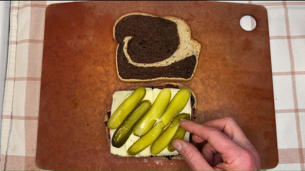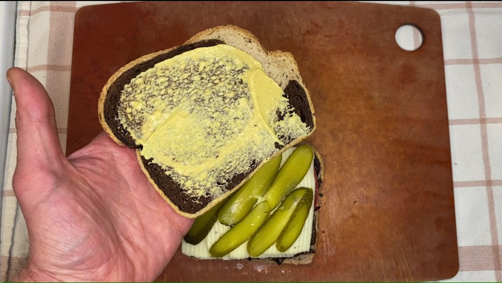 - Finally, apply the mustard to one side of the other slice and close the sandwich.