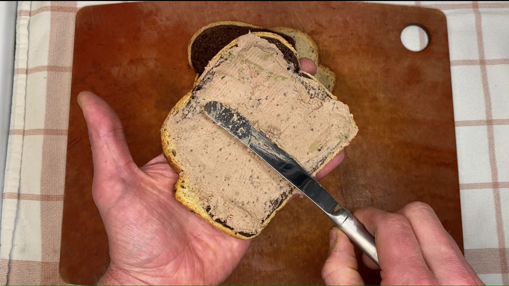 - Take one piece of your bread and spread your pate on one side until evenly distributed.