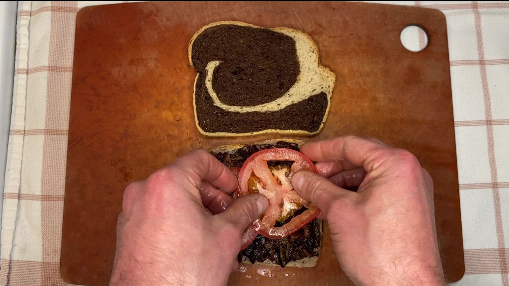 4.) The rest of the sandwich comes together really quickly. Now would be a good time to preheat your toaster-oven or regular size oven to 350 F. Next, the steps for sandwich construction are as follows: