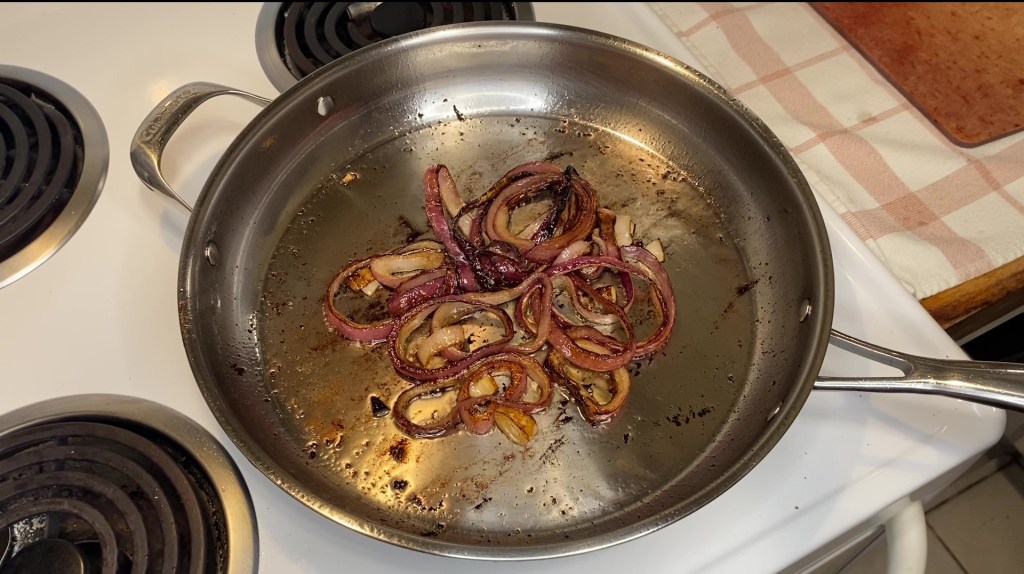 2.) Keep the skillet there with all the wonderful bacon grease and the heat still on, and add your onion rings. You’ll cook these for around 7-8 minutes flipping around occasionally until they too have a bit of a crisp to them. Remove, and let’s continue on to the next.
