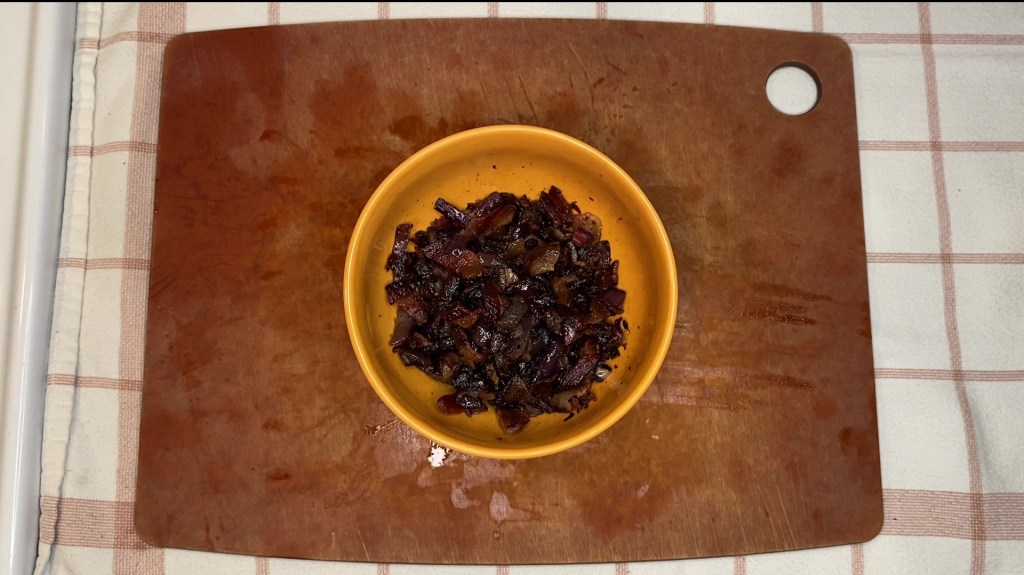 3.) The next step is pretty important, so don’t skip it. One might feel the need to layer the whole strips of bacon on the sandwich and whole rings of onions because…what…it looks cooler? Is it more manly? Well, try biting into that sandwich and having whole strips of bacon come out with each bite and onions falling to the floor. Nobody wants floor onions. We’re going to chop them up and combine them together in a bowl for easy, spreadable, distribution. Once done, set them aside for now.