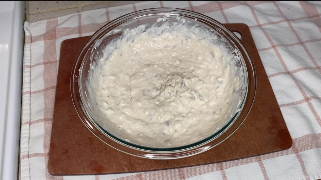 First, shred your Parmigiano cheese. Then, take out your second largest mixing bowl. Open up your can(s) of (whoop ass) condensed cream of mushroom soup and add to the bowl. Then, add the milk and then the cheese. Mix up this dairy wonderland until well combined.