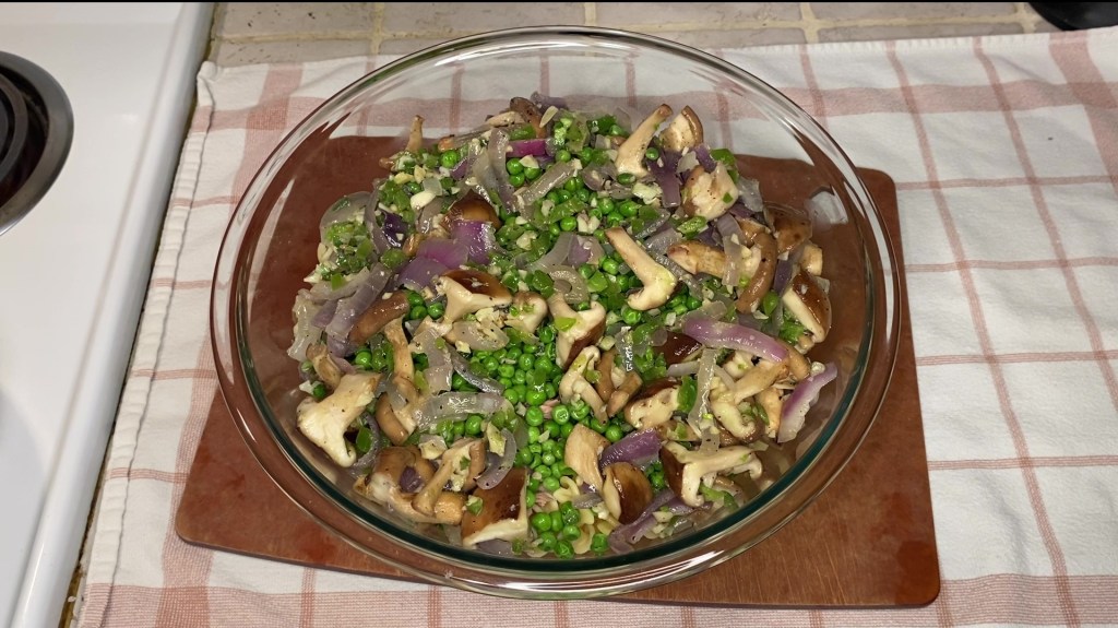 Next, get your largest mixing bowl. Add the pasta, tuna, peas, and your sautéed onions, mushrooms, jalapenos, and garlic.