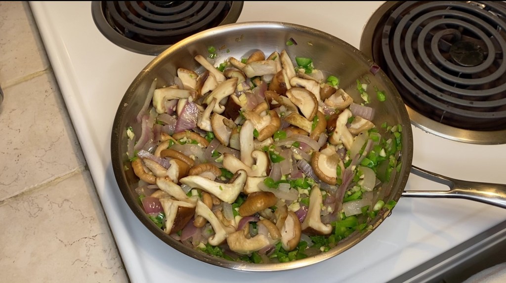Chop your shiitake mushrooms into halves or quarters, depending on the size, just enough to keep their shape somewhat intact. Then, dice your jalapenos. My version is going to add a good kick, so if you want less than that, only add one large jalapeno instead of two. Throw all these into the mix and cook for another 4 minutes, stirring a couple times again. Finish off by dicing the garlic and dropping that in there for about 30 seconds until they become fragrant, add a couple of pinches of salt and pepper each, then stir everything together and set aside as well.