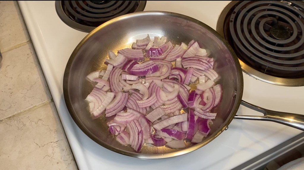 2.) Get a 10 in. stainless steel pan and heat to medium. Slice your onion in half, then into rings, and then into quarter rings each. Cook these for about 4 minutes, stirring a couple times.