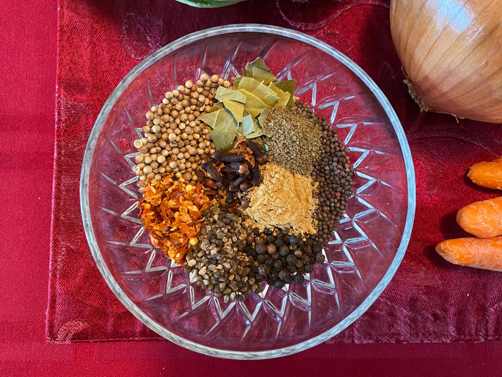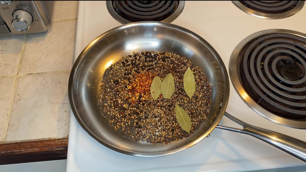 Heat up a 10 in. stainless pan on medium heat. You’re going to toast the following spices first: The coriander seeds, mustard seeds, cardamom seeds, whole cloves, whole peppercorns, and anise seeds. Throw those in the pan for about 3 minutes and swirl around a few times so as to not let them burn. If the seeds start popping, you’re not making popcorn here, so your heat is too high. Next, add your crushed red pepper flakes and bay leaves and heat them up for 30 seconds. You’ll notice a bit of color added to the leaves, which is time to take the whole thing off the heat.